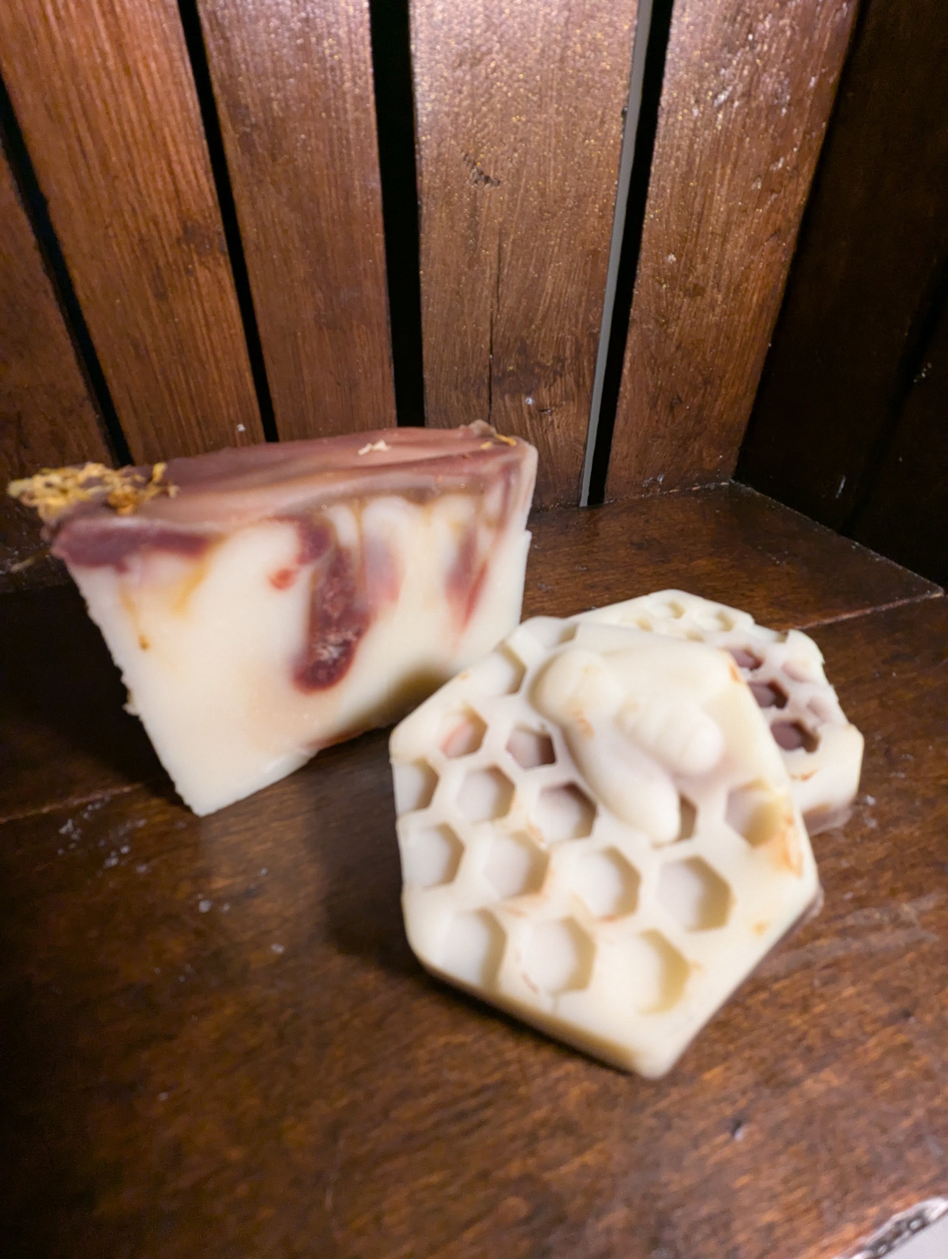 A creamy, elegant bar that wraps your skin in pure comfort. Made with tallow, coconut, and shea butter for deep moisture, blended with manuka honey and kaolin clay for a silky, nourishing lather. Colloidal oats soothe dryness, leaving skin soft, smooth, and hydrated. Each bar is colored with rose and gold mica, topped with calendula petals, and scented with Cocoa Cashmere and Cashmere Plum — a warm, romantic fragrance that lingers softly on the skin.